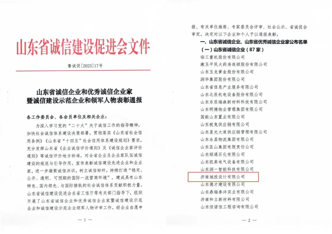 多年來(lái),濟(jì)南城投設(shè)計(jì)有限公司以“為生態(tài)更文明,讓生活更美好”為企業(yè)使命,積極踐行“知行合一,為人民服務(wù)”的企業(yè)核心價(jià)值觀……將誠(chéng)信品質(zhì)深深融入到公司的企業(yè)文化和生產(chǎn)經(jīng)營(yíng)中,塑造了良好的企業(yè)形象,樹(shù)立了良好的社會(huì)聲譽(yù)。